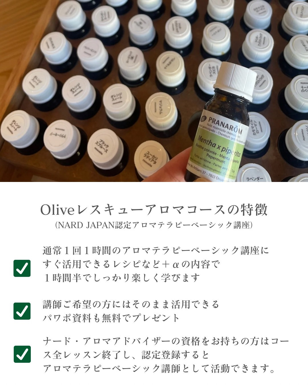 ナード・アロマアドバイザーの資格をお持ちの方は、コース全レッスン終了し、認定登録すると、アロマテラピーベーシック講師として活動できます。